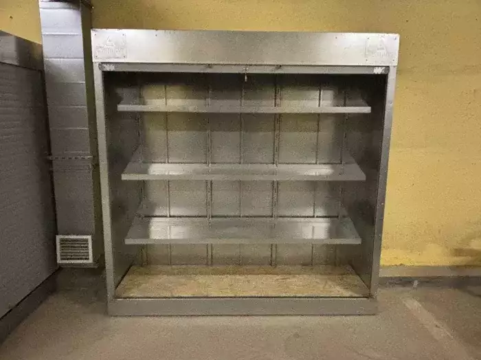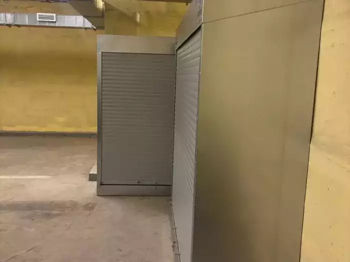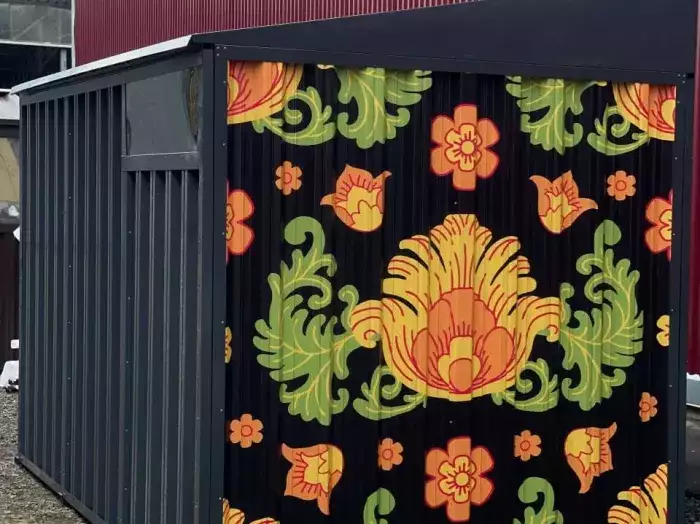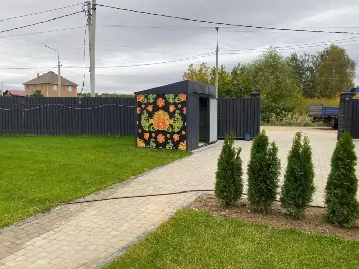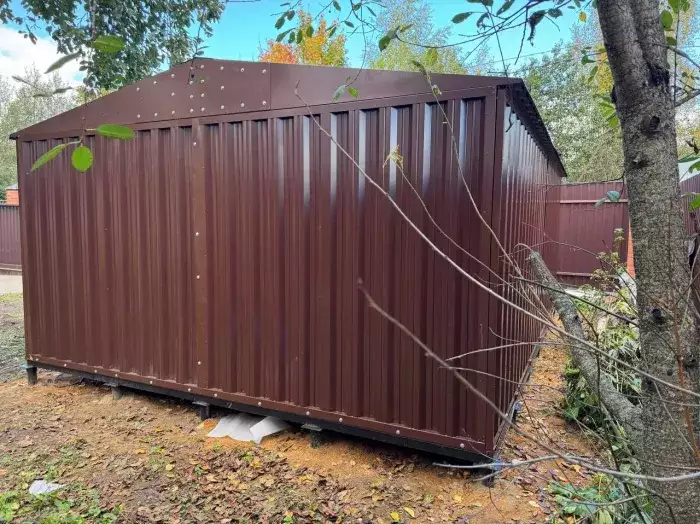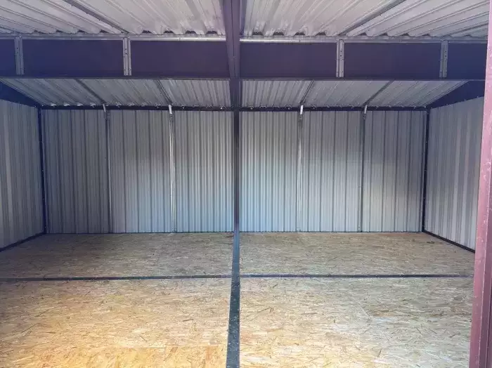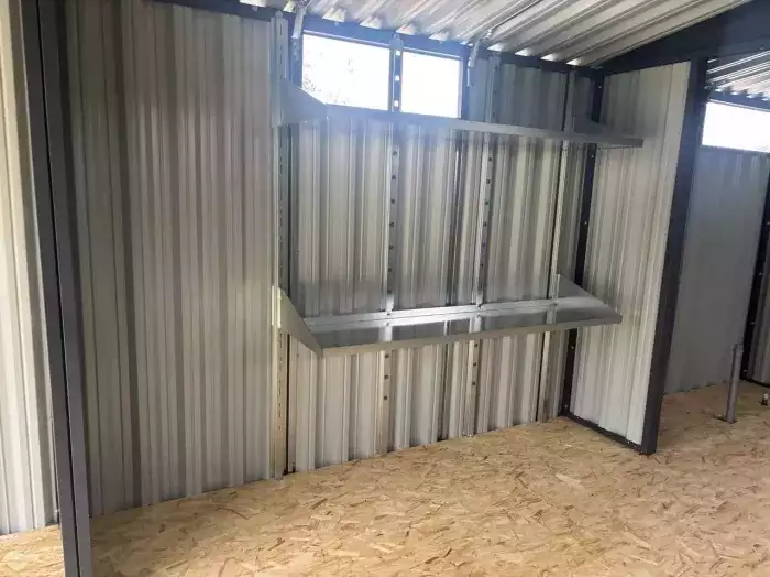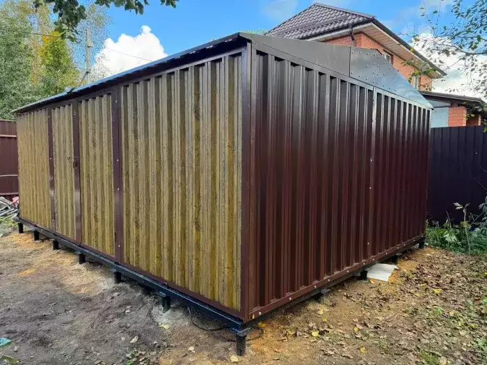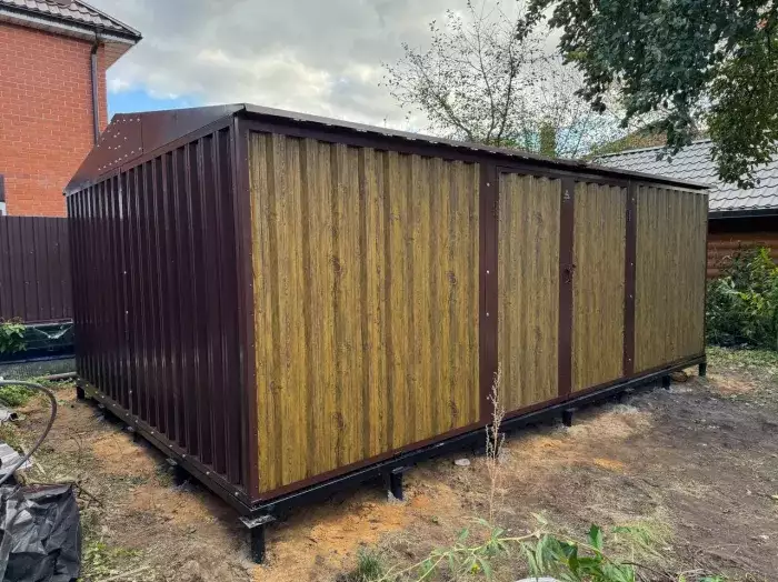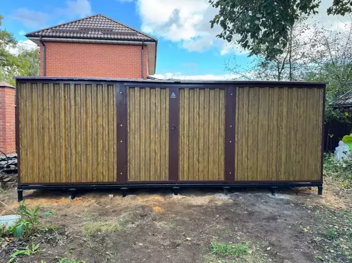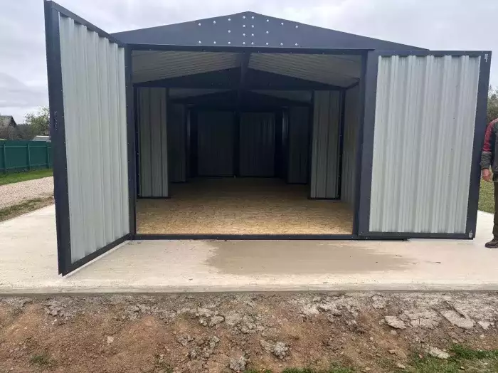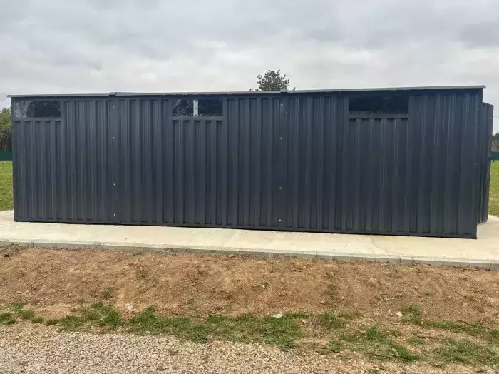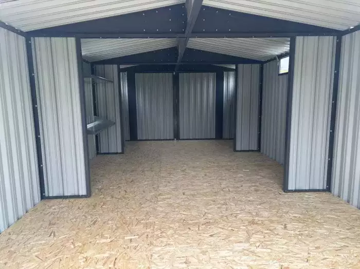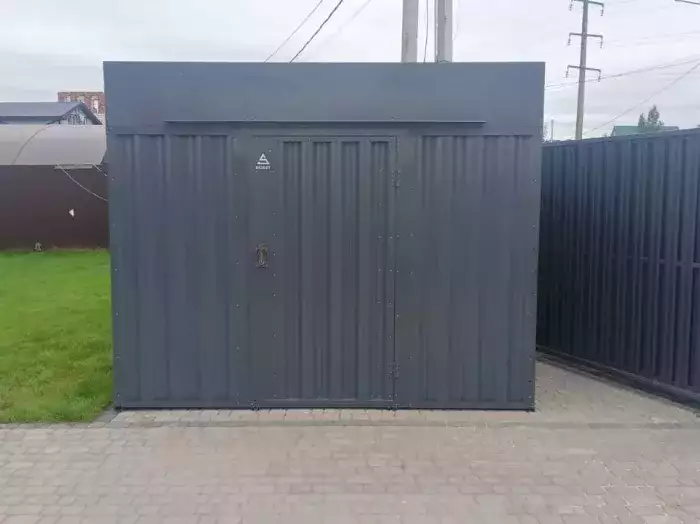 Нами изготовлена стандартная 6-метровая конструкция с плоской крышей и двумя входными группами по торцевой и боковой сторонам в стильном брутальном цвете RAL 7024. Пространство внутри разграничили на две равные части, одна - под хранение инвентаря, другая - под гараж для мотоцикла.
