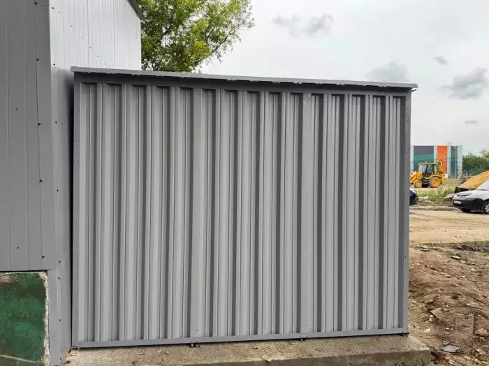 Нами была изготовлена стандартная 4-метровая конструкция с односкатной крышей и боковой воротной группой в популярнейшем шоколадно-коричневом цвете RAL 8017.