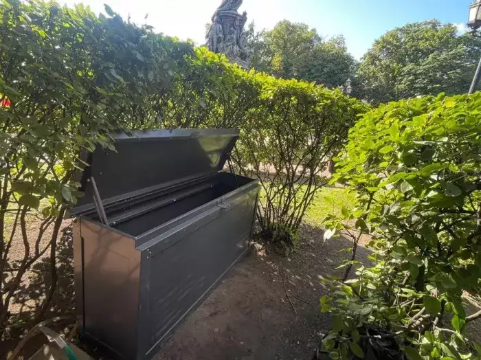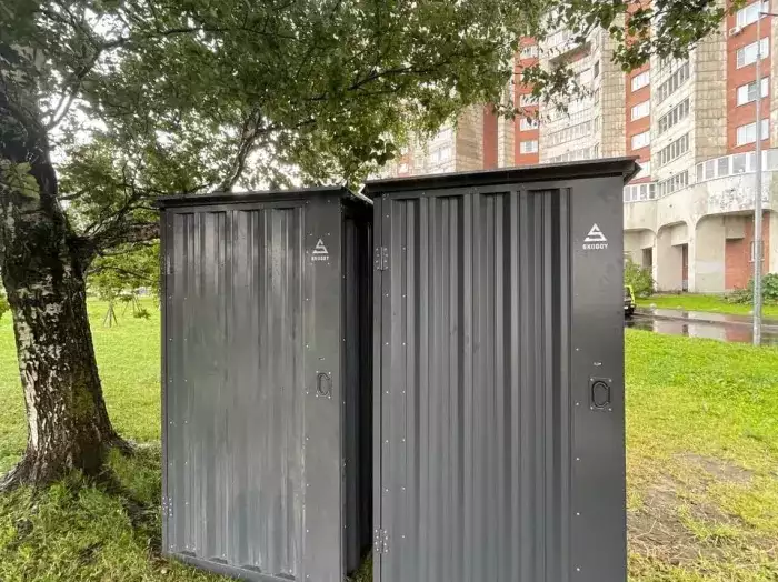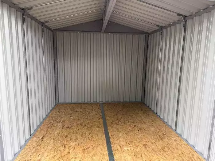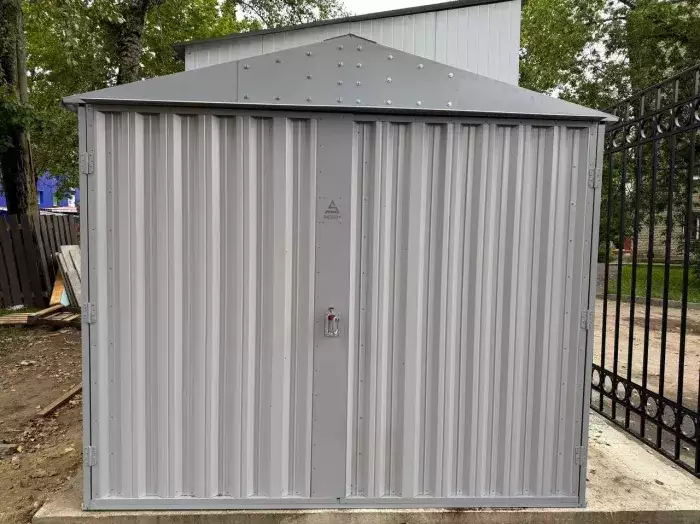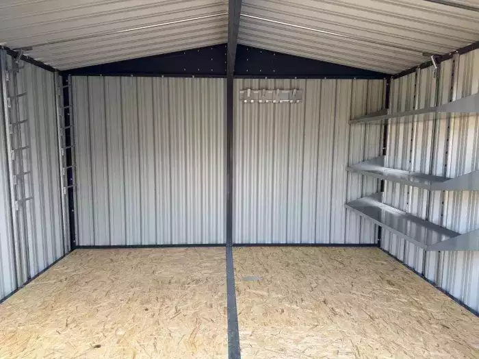 Дополнительно хозблок оборудован двумя световыми окнами по торцевым сторонам изделия, прямым стеллажом с тремя полками, а также пандусами для комфортного въезда техники.