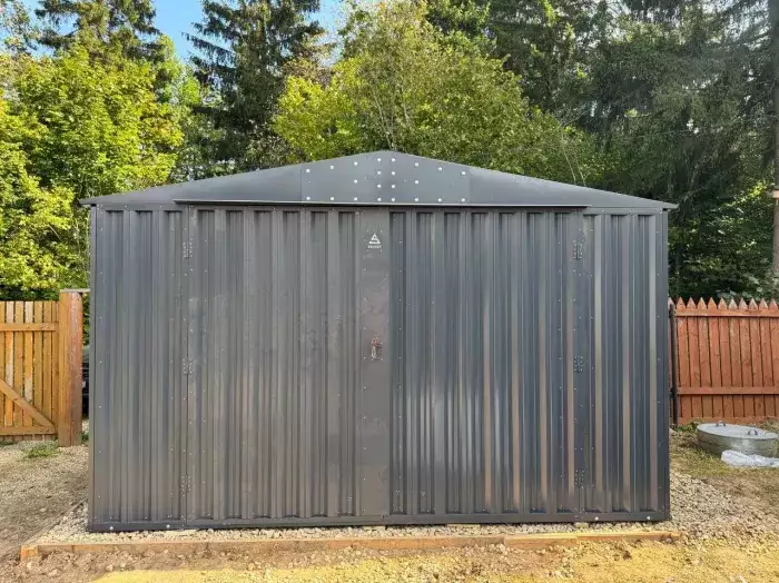 Проект: 4-метровый хозблок для хранения инвентаря, садовой техники и снегоуборочной машины в шоколадно-коричневом цвете.