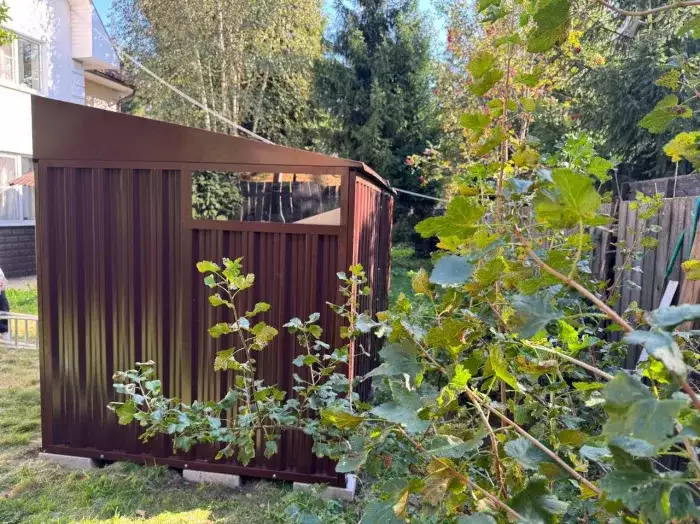 Прекрасной заказчице этого проекта на участок была необходима компактная конструкция для хранения различного инвентаря и хозяйственных принадлежностей.