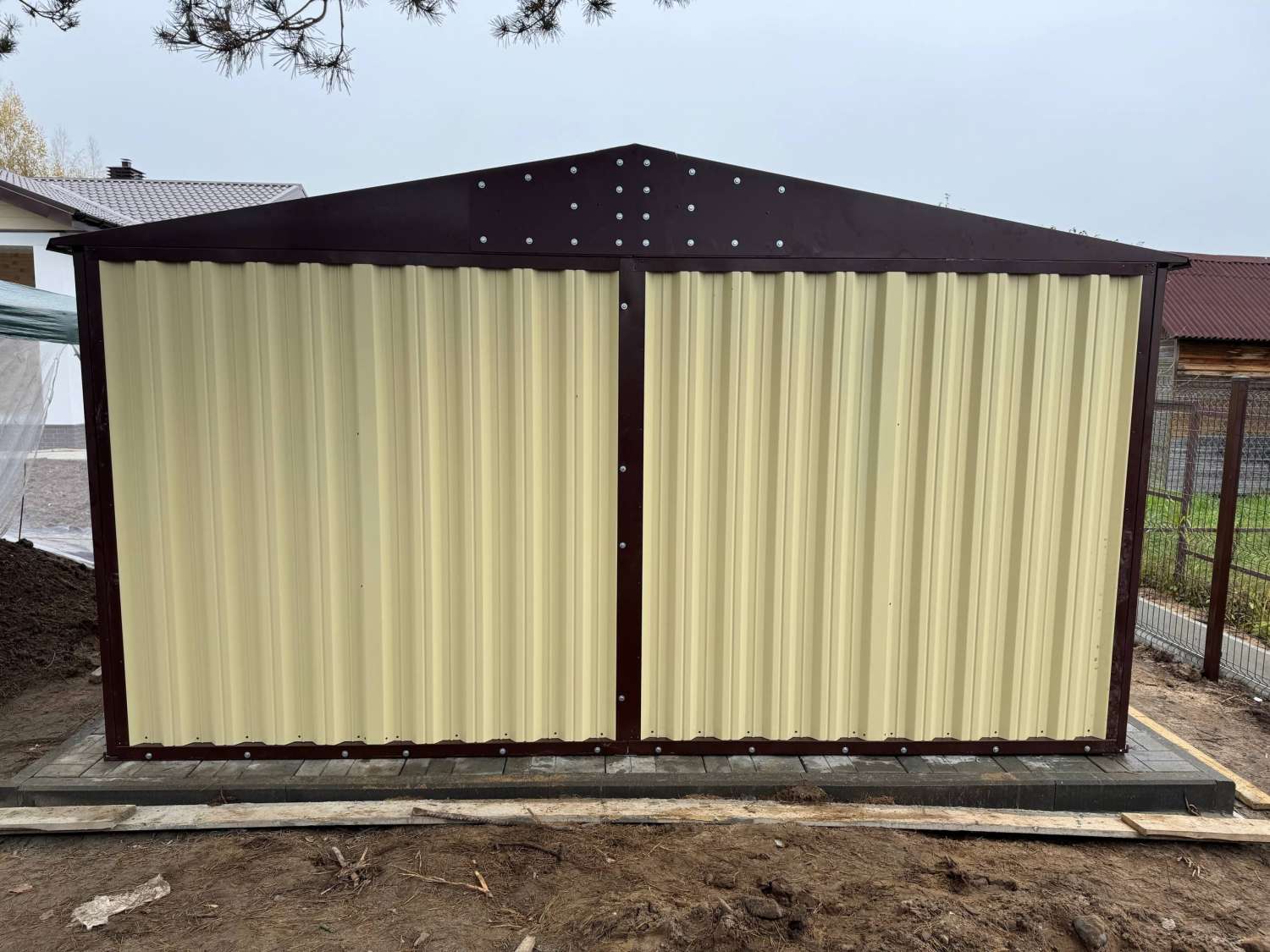 Нами была изготовлена широкая 3-метровая конструкция с двускатной крывшей и торцевой воротной группой в потрясающе красивом сочетании расцветок нежного RAL 1014 «слоновая кость» для основных элементов и шоколадно-коричневого RAL 8017 для фасонных элементов и крыши. По желанию заказчика изделие выполнено из листа толщиной 0,7 мм.