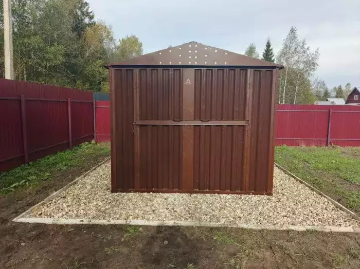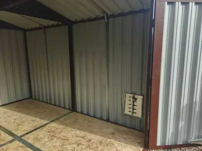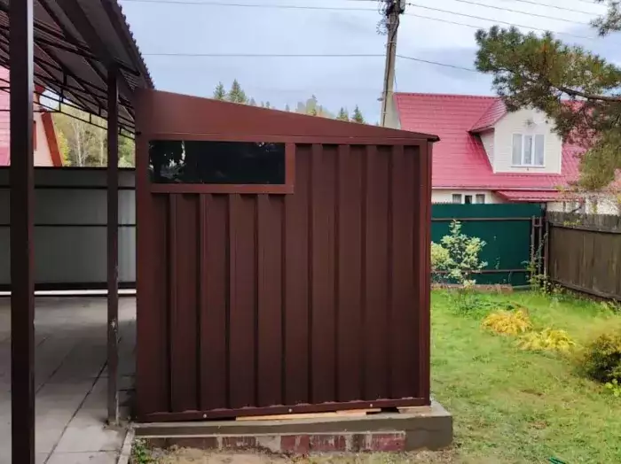 Так как в хозблок не планировался заезд габаритной техники, вместо полноценной воротной группы была установлена дверь шириной 1 м. По боковой стороне установили окно размером 90 х 30 см для попадания естественного света внутрь постройки. Также хозблок дополнили велосипедной стойкой.