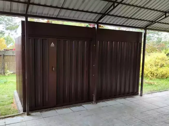 Нами была изготовлена конструкция размером 3 х 3 м с двускатной крышей и торцевой дверью в интересном сочетании расцветок «под дерево» Дуб грей для основных элементов и графитового RAL 7024 для фасонных элементов и крыши.