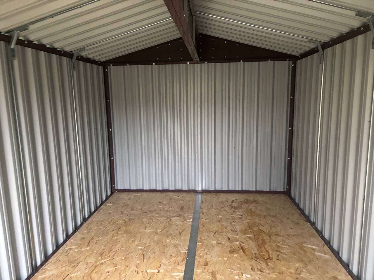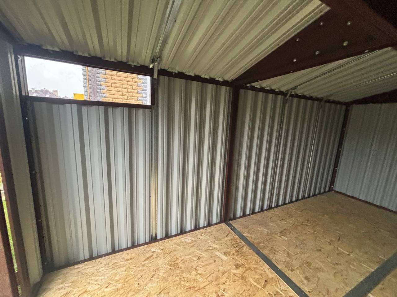 Нами была изготовлена конструкция по индивидуальным параметрам размером 5 х 2,7 х 2,45 м с двускатной крышей и торцевой воротной группой в стильном и популярном шоколадно-коричневом цвете RAL 8017. Именно такая расцветка была выбрана для того, чтобы постройка гармонировала по цвету с забором на участке.