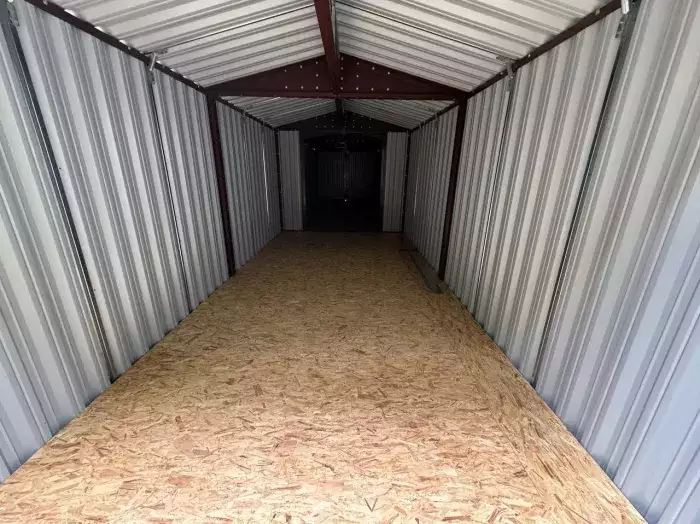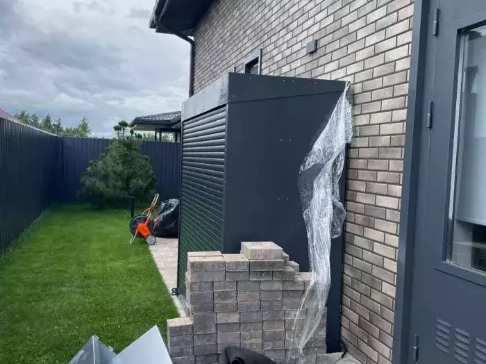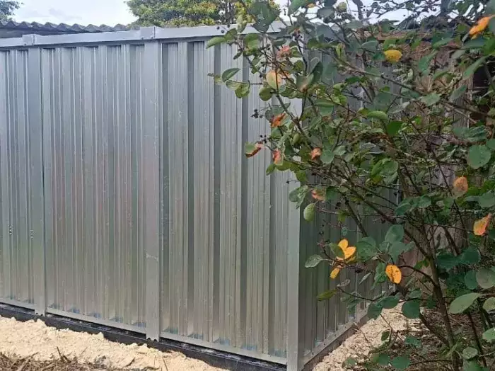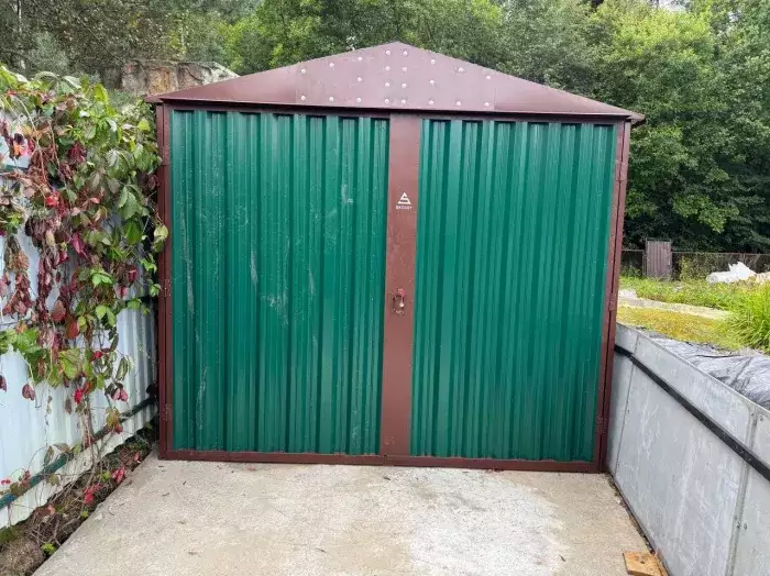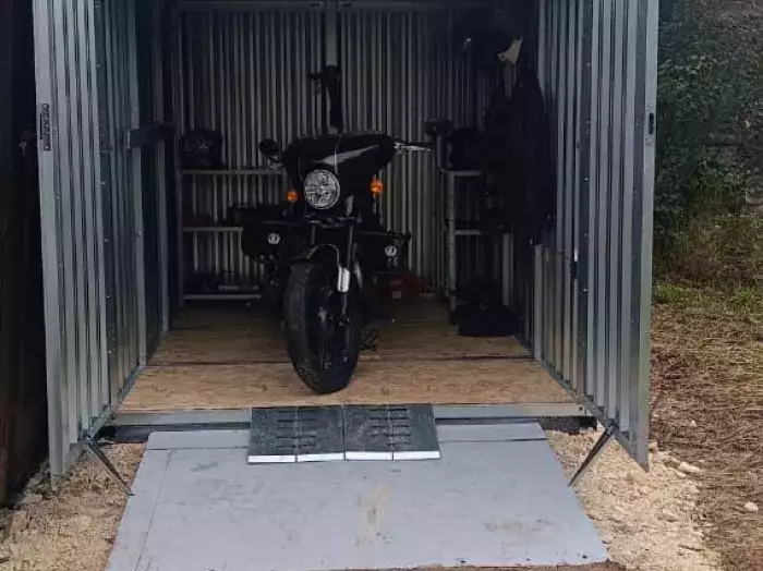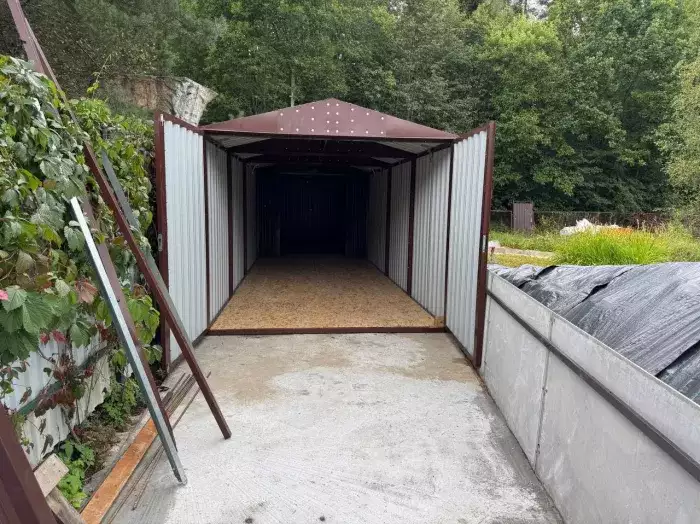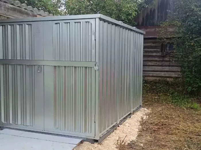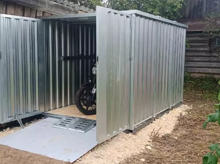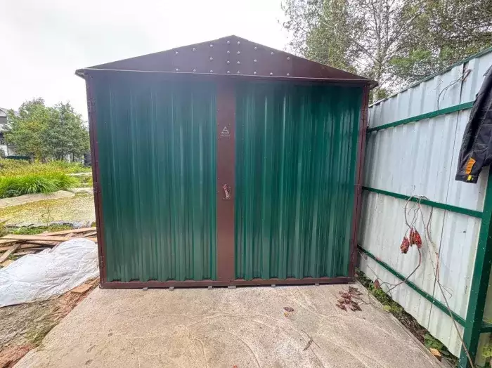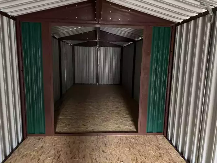 Также в проект включили дополнительную дверь сбоку и укомплектовали системами хранения: прямым и угловым стеллажами, а также инструментальной панелью. Постройка получила один из популярных расцветок – прекрасный шоколадный цвет RAL 8017.