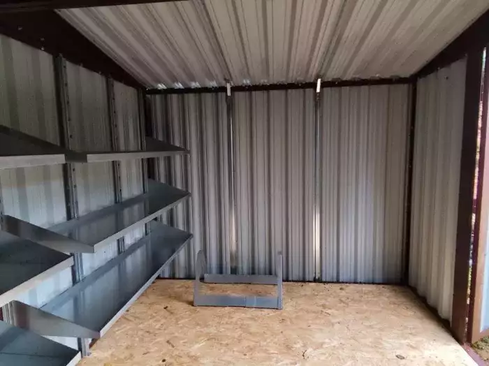 К нам обратился клиент, у которого уже имелся блок-контейнер от компании SKOGGY. Он решил усовершенствовать его и оптимизировать хранение инвентаря с помощью углового стеллажа и специальной системы на направляющих.