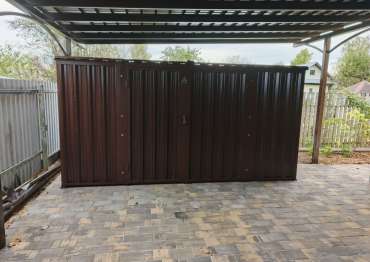 Нами была изготовлена стандартная 4-метровая конструкция с плоской крышей и боковой воротной группой в популярнейшем шоколадно-коричневом цвете RAL 8017.
