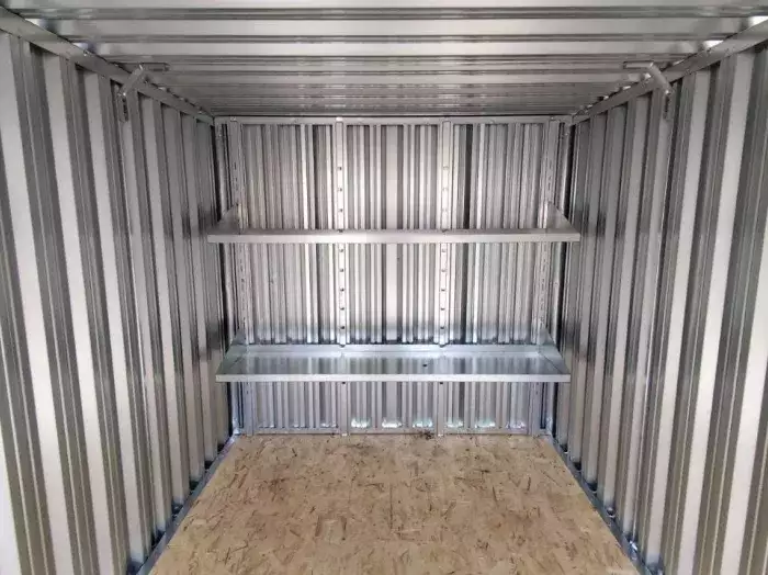 Дополнительно хозблок оборудован входной дверью с торцевой стороны, металлическим полом, прямым стеллажом, угловым стеллажом, а также тремя световыми окнами размером 90 х 30 см.